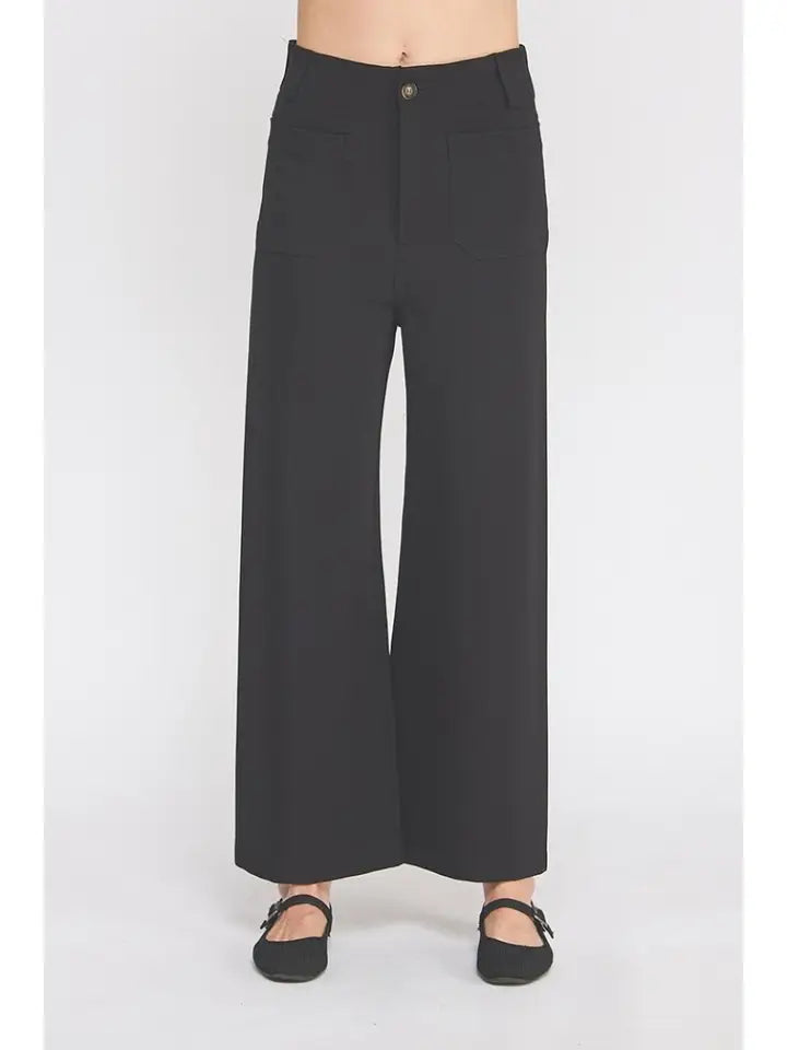 This is a great Black pant that is ankle length on most. Waisted with belt loops, front zip and button closure. There are front patch pockets. The knit gives this pant a moderate amount of stretch.