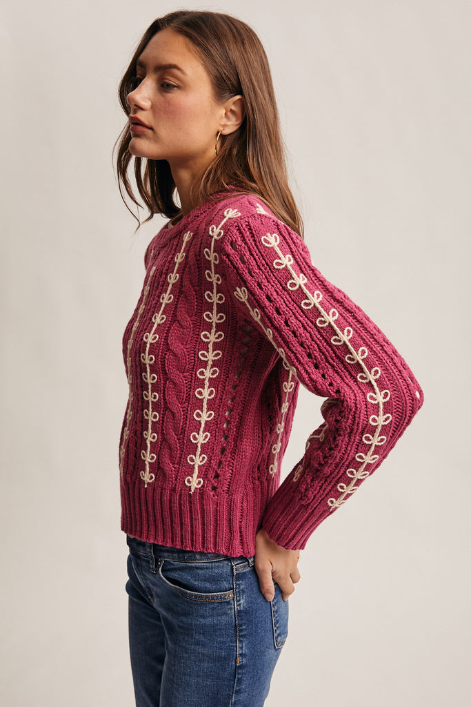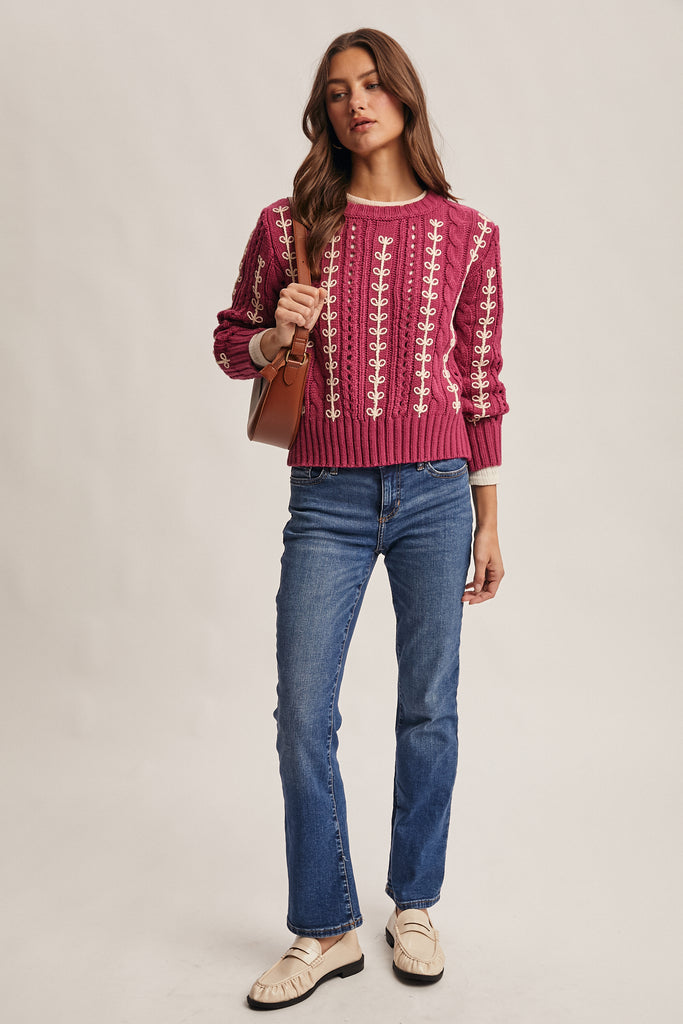 Very flirty long sleeve sweater in Magenta with a vertical Cream embroidery on the bodice and sleeve. Very cute!