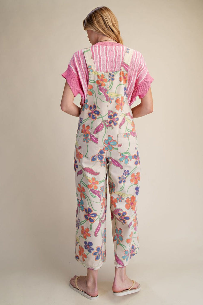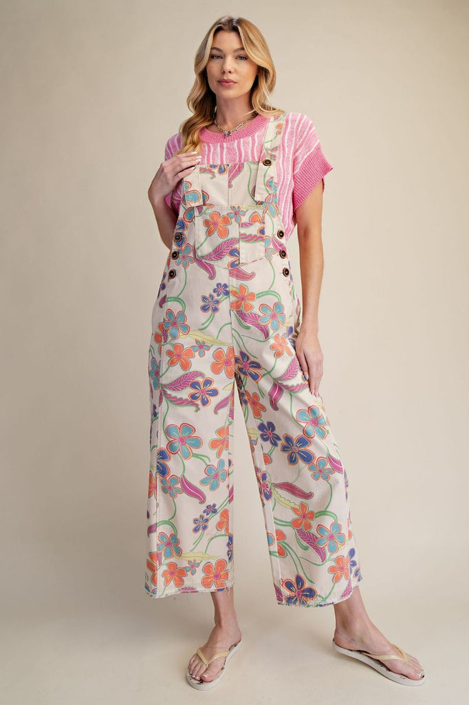 So fun! Check out these wide leg coveralls in the Flower printed vintage wash. The base color is Ecru with pastel Orange, Blue, Green, flowers.