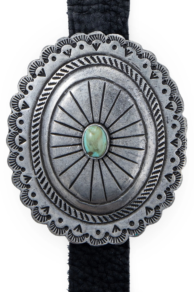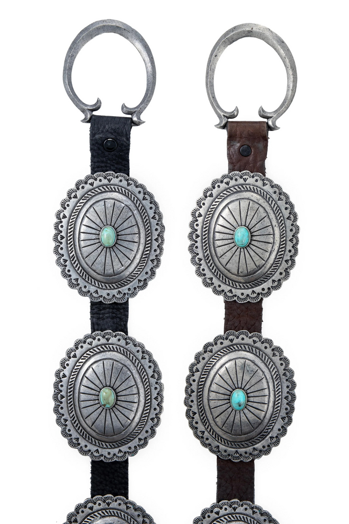 Brown leather with 6 large silver concho and Turquoise center accent. 36"