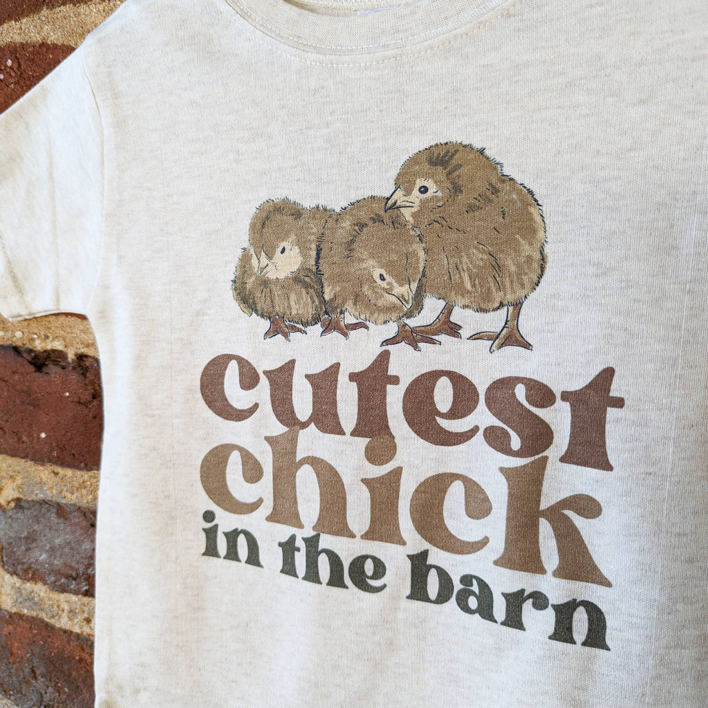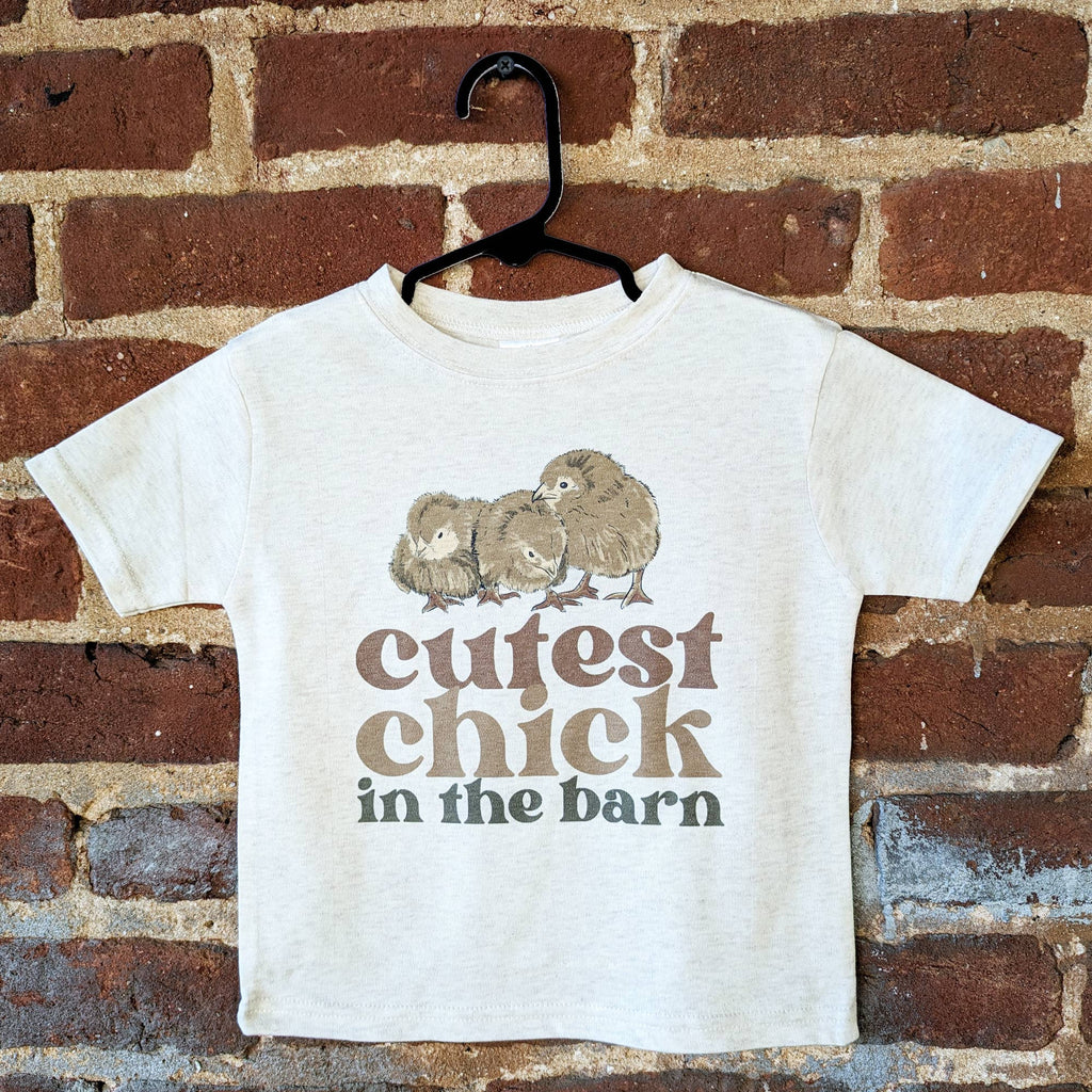 "Cutest chick in the barn" Let your customers share their love of farm animals with this super soft tee! Designed and printed right in North Carolina, this design was inspired by our own chicks and can easily be dressed up or down for a trip to the farm. Sizes available include: 2T, 3T, 4T, 5T, Youth XS (4-6), Youth S (8-10).