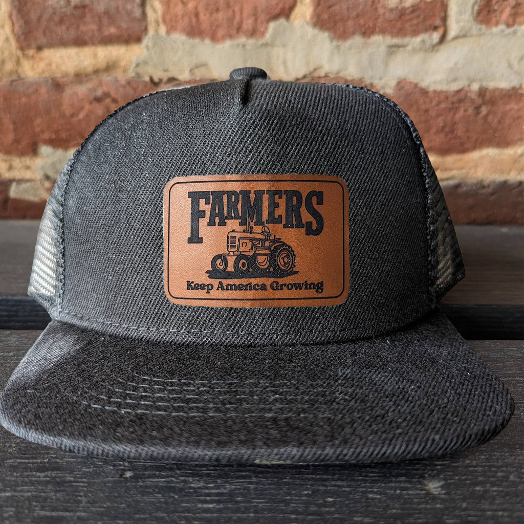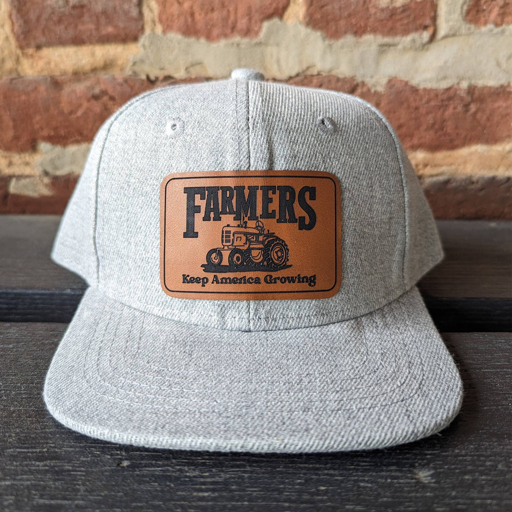 "Farmers keep America growing", mesh adjustable snapback hat Does your kid love tractors? In pairing original artwork with a leather patch and high quality craftsmanship, the hat is perfect for all your days on the farm! **SIZING INFO** Fits 18”-21” head circumference and have a mesh backing. The adjustable straps fit head circumference of 18-21 inches and fit best on ages three and up. Measure your child's head circumference to be sure!