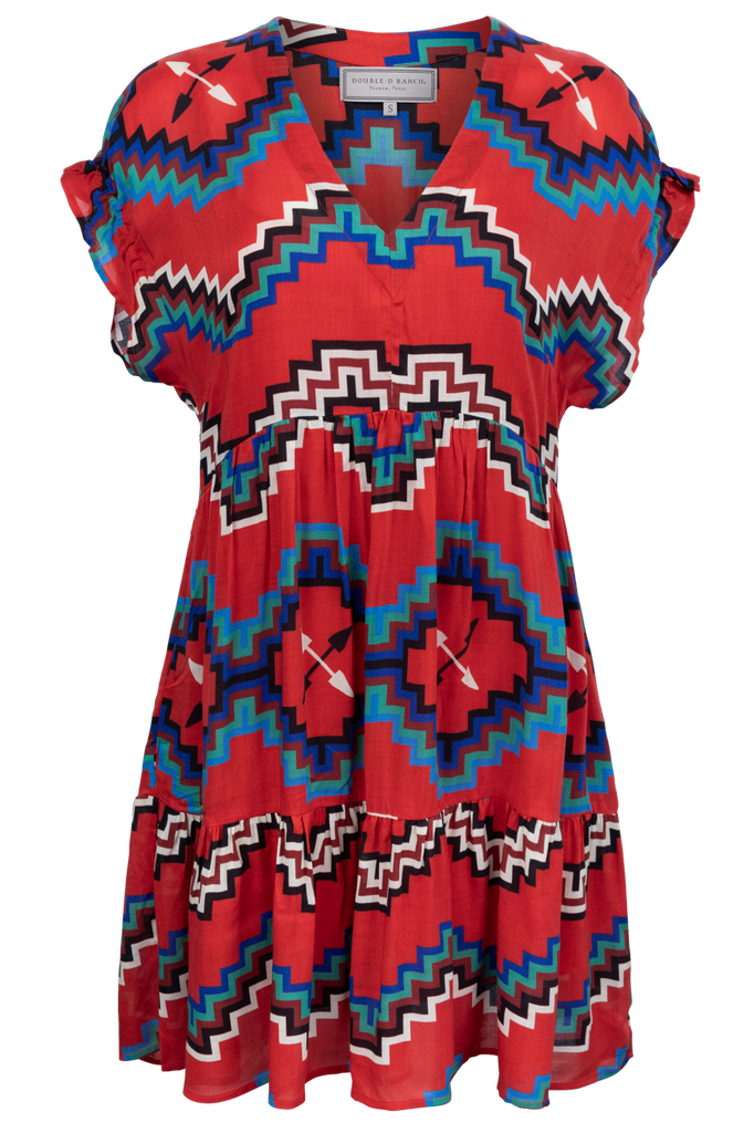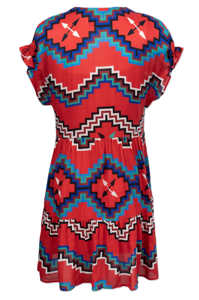 Interesting cap sleeve with a V neck and empire waist. This dress is full cut and plenty of swing. Completely lined and hits just below the knee. All in a wonderful red Aztec pattern.